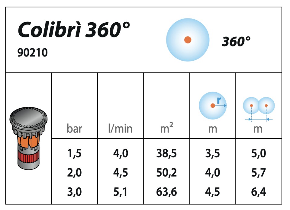 The Claber Colibri 90210 is a 360° pop-up sprinkler. It is ideal for watering small gardens and vegetable patches, even at low pressure. The pop-up has a range of up to 4 meters. It can be adjusted to provide a gentle rain effect over a 360° circular area. The sprinkler is connected to the 1/2" (13-16 mm) main tube using the 1/2" (15-21 mm) threaded 3-way connector or 1/2" (15-21 mm) threaded elbow.