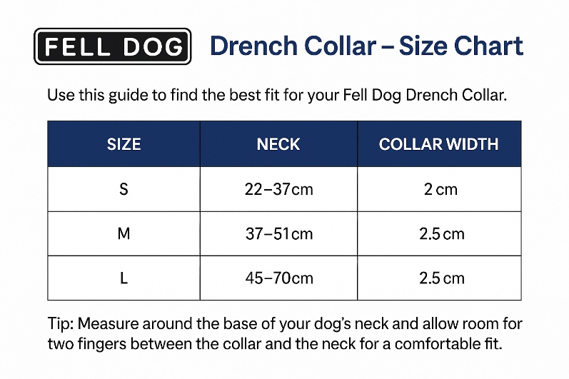 Measure your dog’s neck with a soft tape and add two fingers of space for comfort. Match the measurement to the Fell Dog sizing guide for an adventure-proof fit.